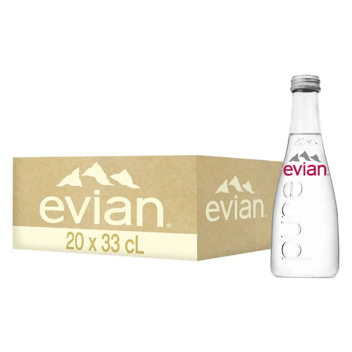 ארגז מים בזכוכית של אוויאן בגודל 330 מל' (20 יח'). המים של אוויאן, מים מהאלפים של הרי צרפת- טהורים ונקיים. אוויאן ממותגי המים היוקרתיים ביותר בעולם.
