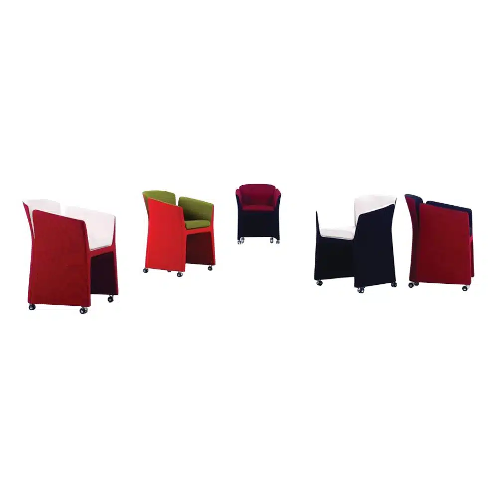 כורסת אירוח מעוצבת ומרווחת, גוף פלסטיק, מושב ריפוד בד, 4 גלגלים