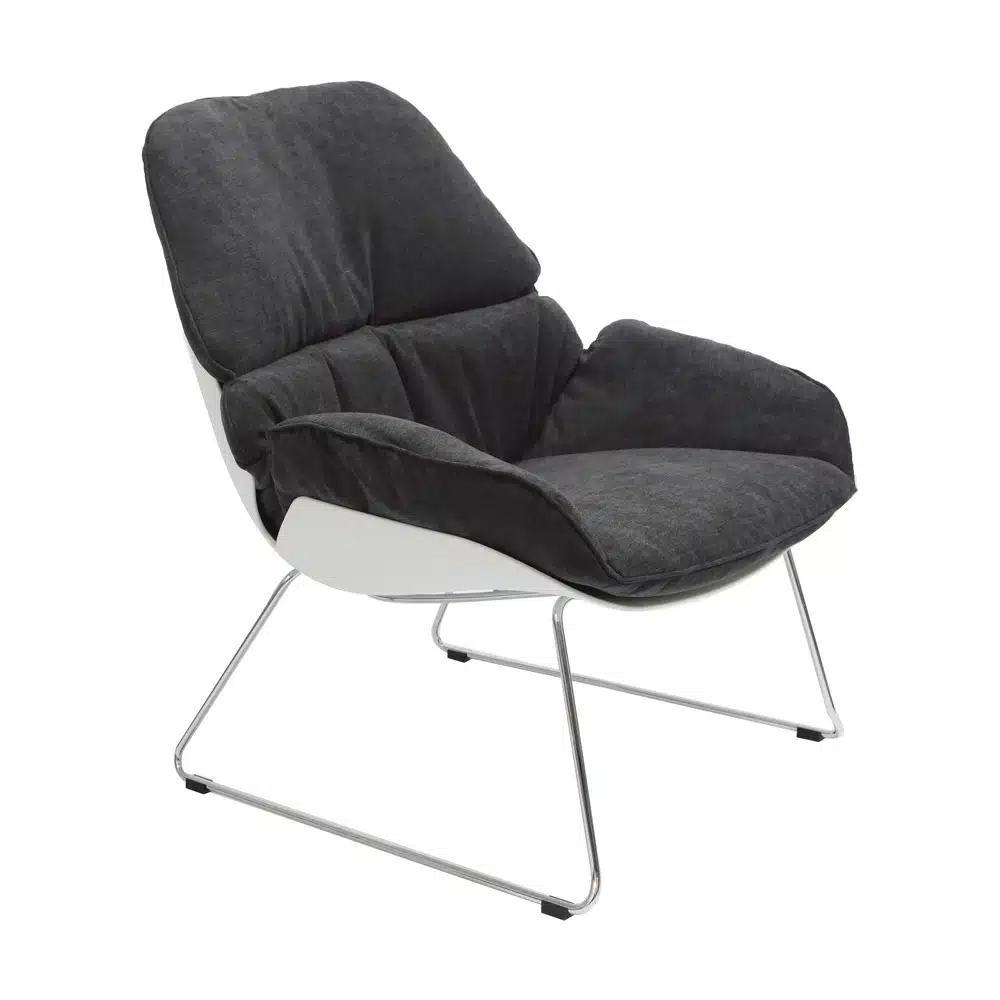 כורסת אירוח-המתנה מעוצבת, גב חיצוני פלסטיק, מושב ריפוד בד, שלד מגלש ניקל