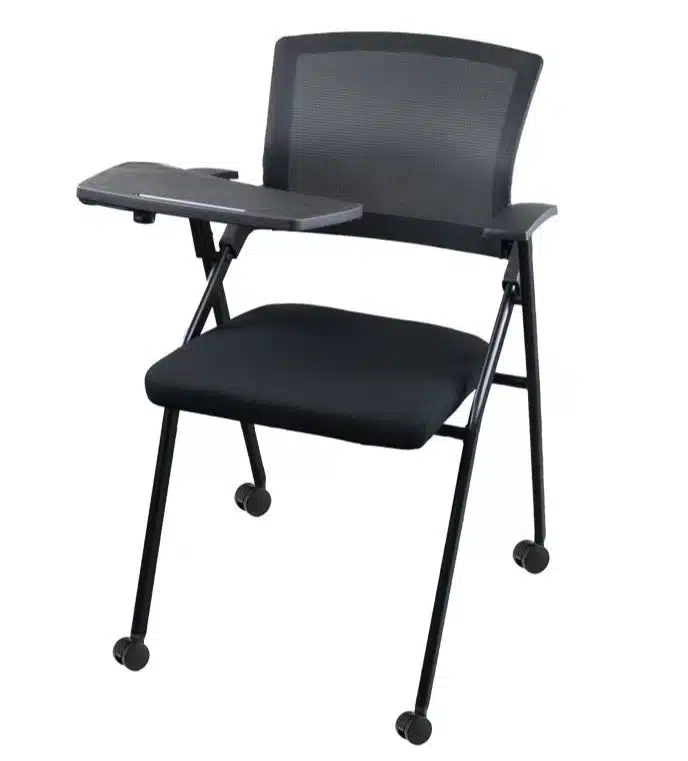 כסא סטודנט על גלגלים בעיצוב ארגונומי, מושב פלסטיק עם כרית בריפוד בד, משטוח כתיבה