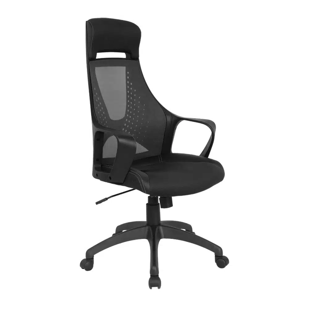 כסא עבודה-מחשב עם משענת ראש, גב רשת ומושב ריפוד בד, מנגנון מכני, ידיות קבועות, רגל ניילון